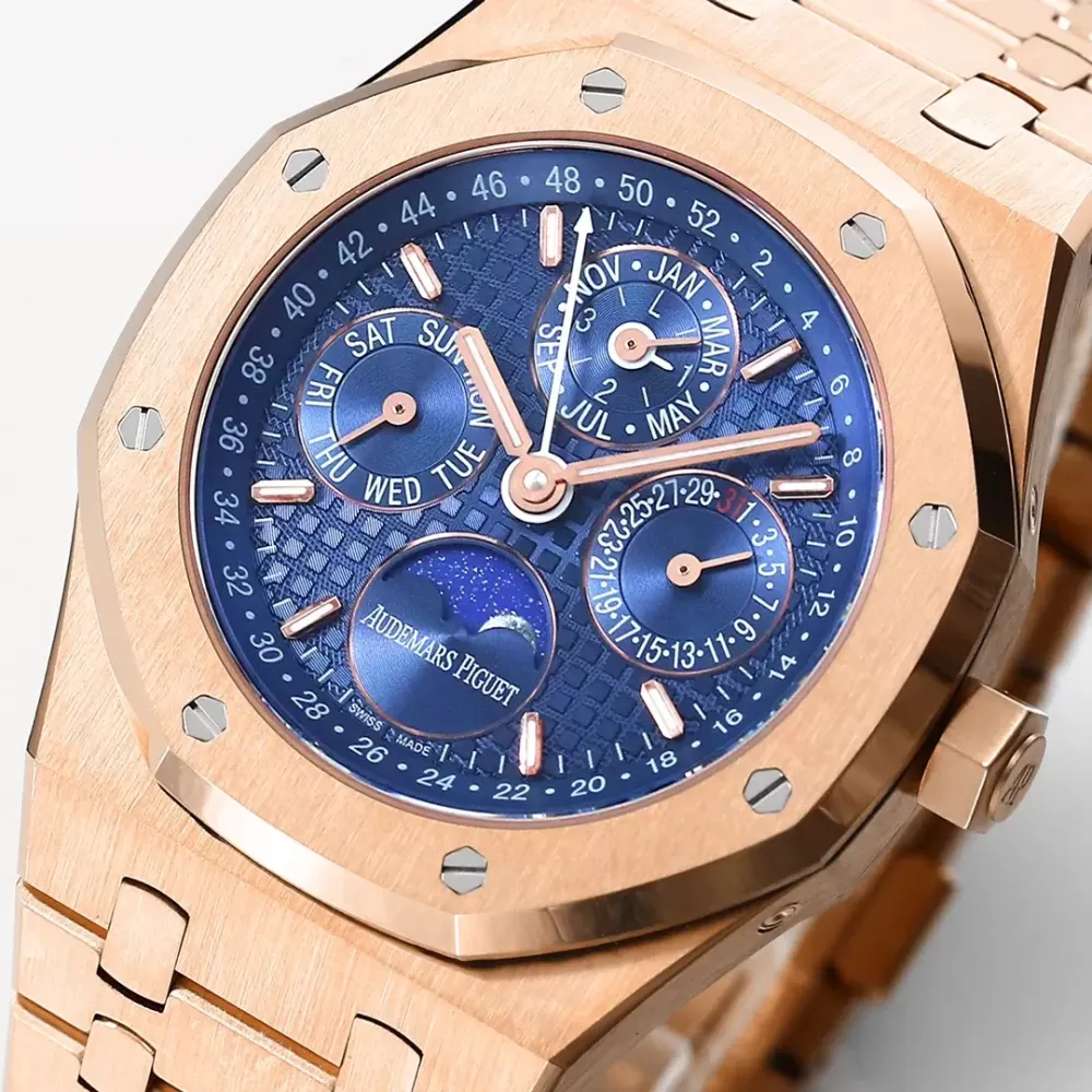 The noble watch Audemars Piguet Royal Oak series perpetual calendar watch, with its noble and elegant blue plate and cool stainless steel case, perfectly embodies Audemars Piguet's aesthetic design and extremely high technology of complex functions.