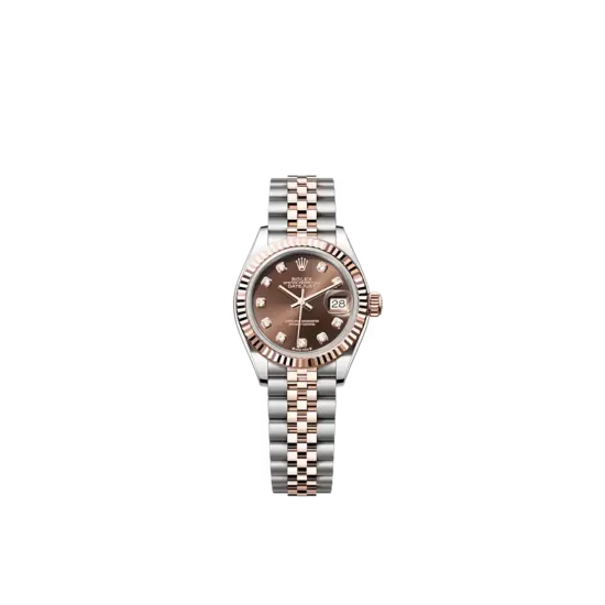 Rolex Perpetual Lady-Datejust Watch of Stainless Steel and 18 k Everose Gold. Chocolate dial set with diamonds. Hour markers – Diamonds in 18k gold settings. The fluted 18k Everose Gold bezel. The Stainless Steel and 18k Everose Gold Jubilee Bracelet, 279171-0011.