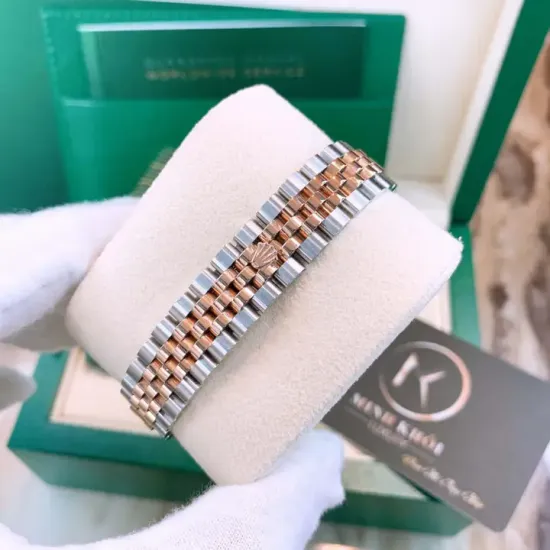 Rolex Perpetual Lady-Datejust Watch of Stainless Steel and 18 k Everose Gold. Chocolate dial set with diamonds. Hour markers – Diamonds in 18k gold settings. Screw-down solid crown with twin lock double waterproofness system. Scratch-resistant sapphire crystal with cyclops lens over the date. The watch is equipped with central hour, minute, and seconds hands, instantaneous date with rapid setting, and stop-seconds. The fluted 18k Everose Gold bezel. The Watch comes with Mechanical Self-winding Movement & 2236 Caliber w/ 31 jewels & 55 hours power reserve. The Jubilee Stainless Steel and 18 k Everose Gold bracelet with concealed folding Crownclasp. The Watch is with a Rolex Watch box, Rolex Warranty Card. Covered with Rolex Warranty.