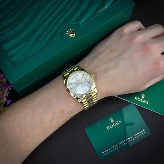 The Rolex fluted bezel is a mark of distinction. Originally, the fluting of the Oyster bezel had a functional purpose: it served to screw the bezel onto the case helping to ensure the waterproofness of the watch. It was therefore identical to the fluting on the case back, which was also screwed onto the case for waterproofness, using specific Rolex tools. Over time, the fluting became an aesthetic element, a genuine Rolex signature feature. Today the fluted bezel is a mark of distinction, in gold on this Day-Date 40.