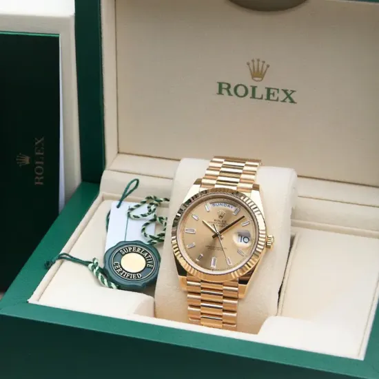 The self-winding Rolex Day-Date 40 is showcased here in 18ct yellow gold, with a 40mm diameter, mono-bloc middle case screw-down case back, and winding crown with Twinlock double waterproofness system. Complementing the case is the Champagne coloured dial with its stunning 10 baguette diamond hour markers, which is protected by a scratch-resistant sapphire with a cyclops lens over the date.  The power behind this timepiece is the Caliber 3255, Manufacture Rolex which offers functions that include center hour, minute and seconds hands, instantaneous day and date in apertures, unrestricted rapid settings, and stop-seconds for precise time setting. It has a power reserve of approximately 70 hours and is water-resistant up to 100 meters / 330 feet, and further enhanced by the application of the President bracelet with its semi-circular three-piece links in 18ct yellow gold and secured with a concealed folding Crownclasp.