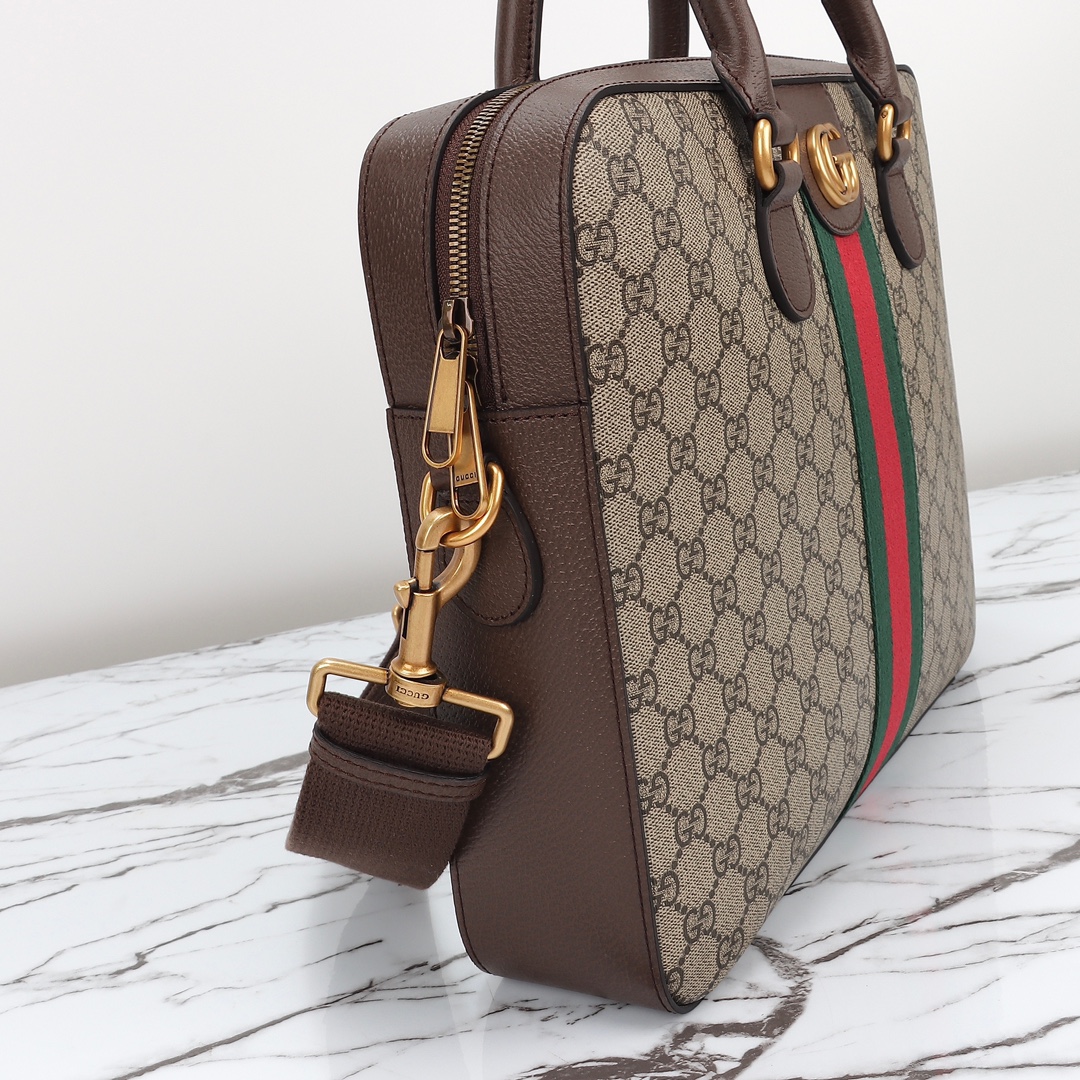 The Ophidia series introduces a brand-new designed briefcase, made of high-quality artificial canvas material, adorned with the brand's iconic stripe webbing and double G monogram hardware, two classic elements. The dual handle design, combined with a detachable shoulder strap, offers multiple carrying options. A secure zipper closure and a large internal open pocket add to the charm of the entire design.