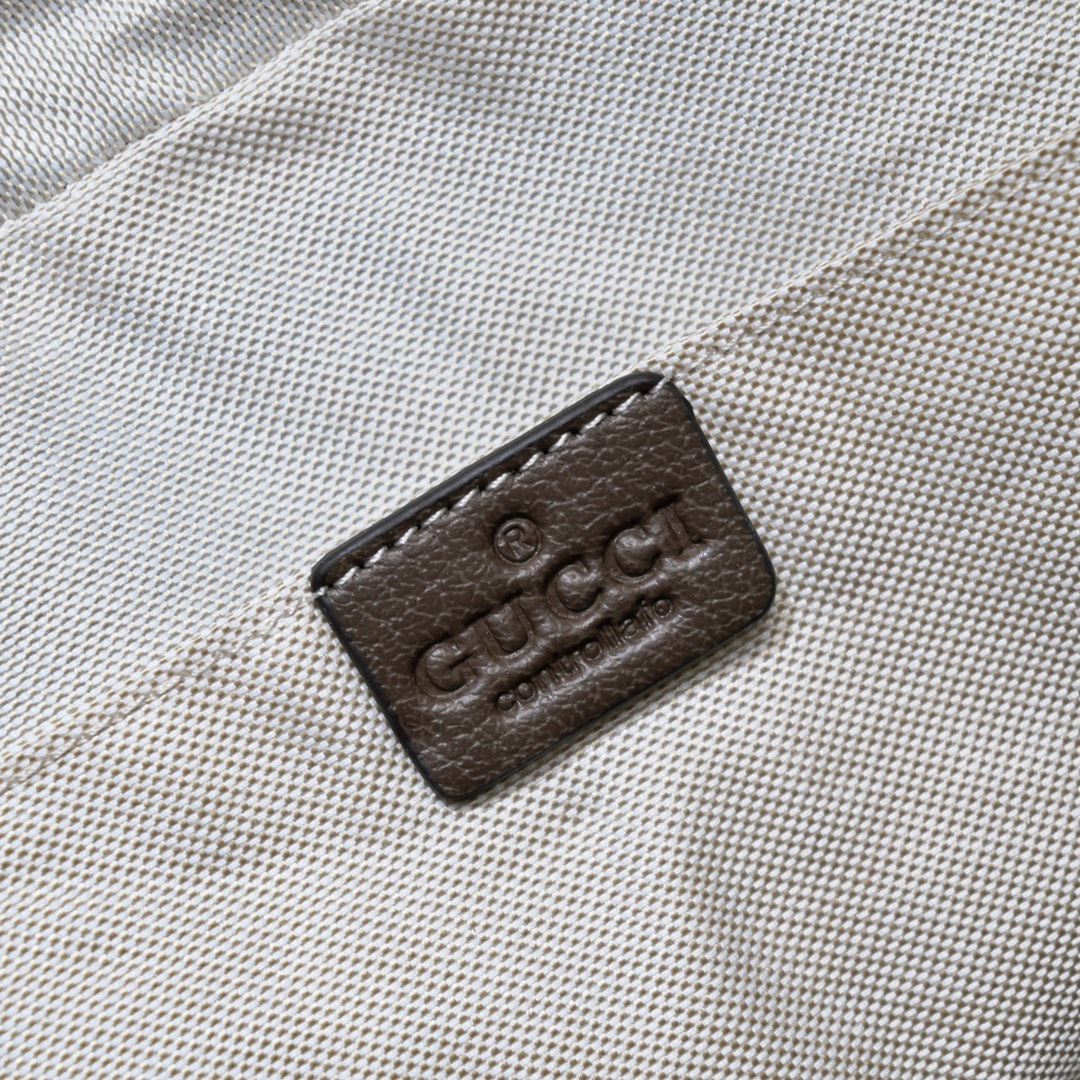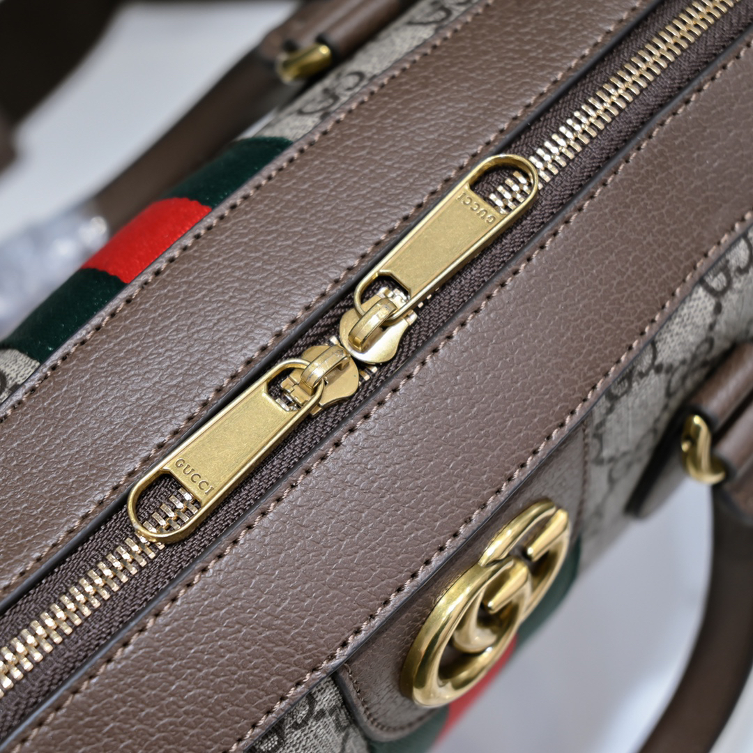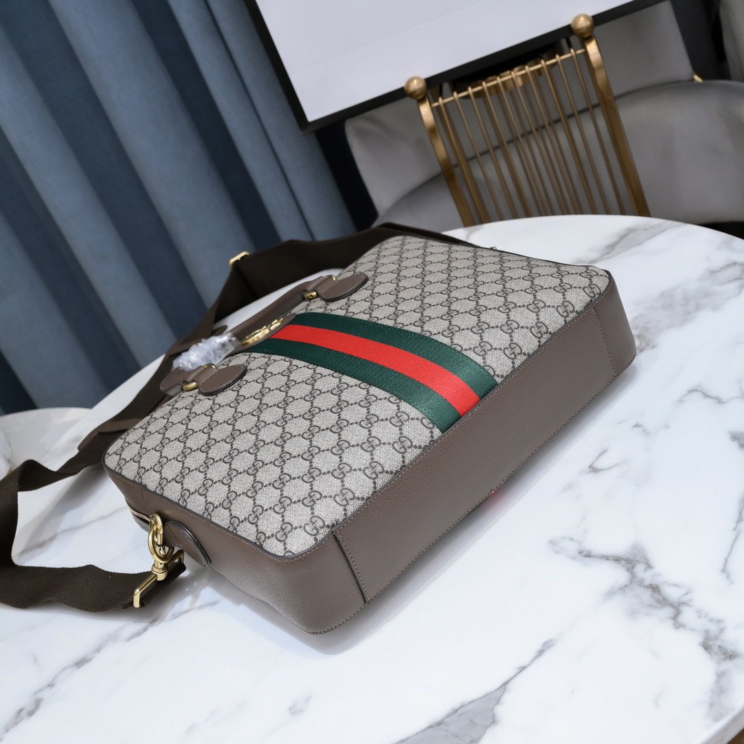 The Ophidia series introduces a brand-new designed briefcase, made of high-quality artificial canvas material, adorned with the brand's iconic stripe webbing and double G monogram hardware, two classic elements. The dual handle design, combined with a detachable shoulder strap, offers multiple carrying options. A secure zipper closure and a large internal open pocket add to the charm of the entire design.