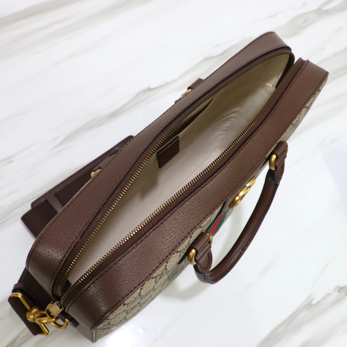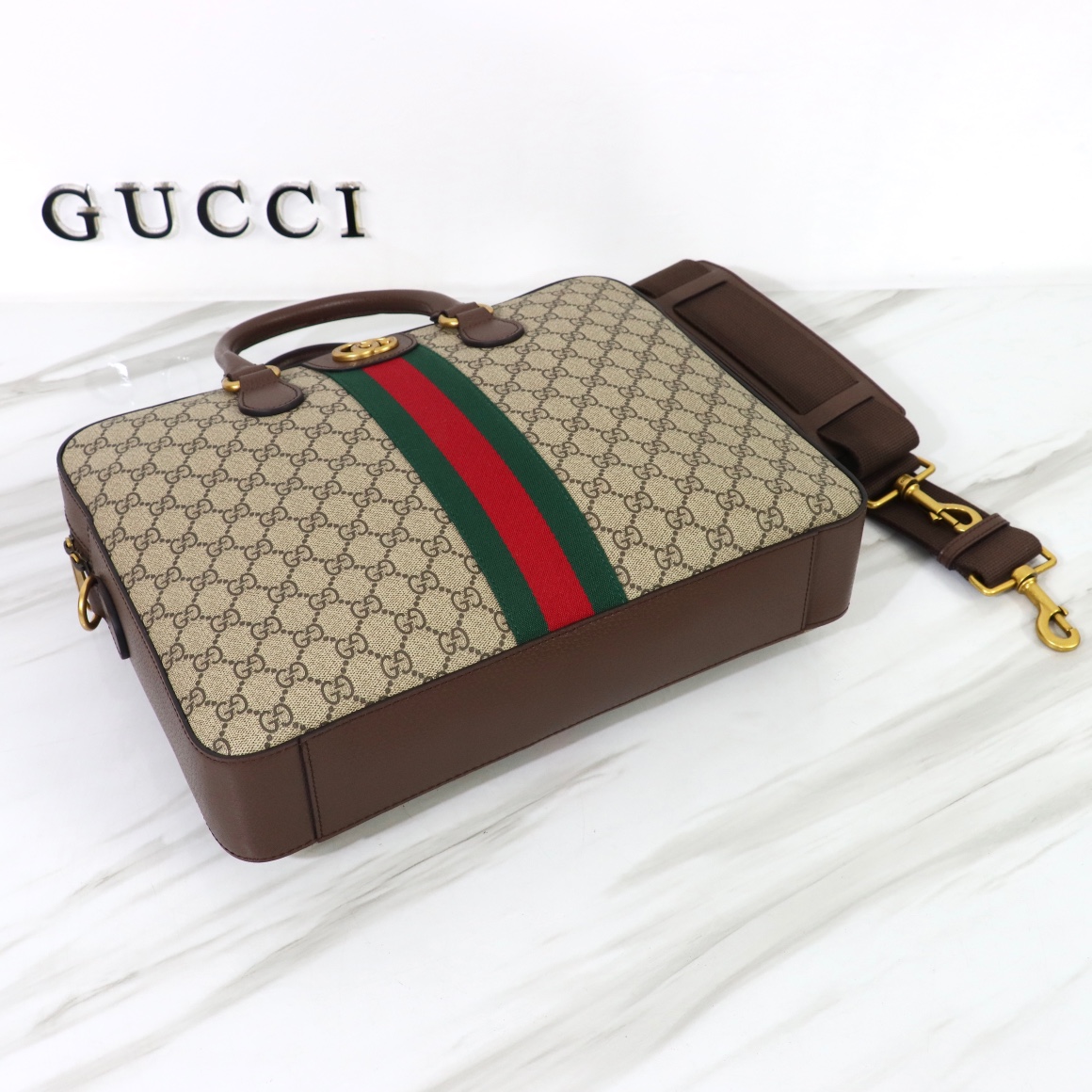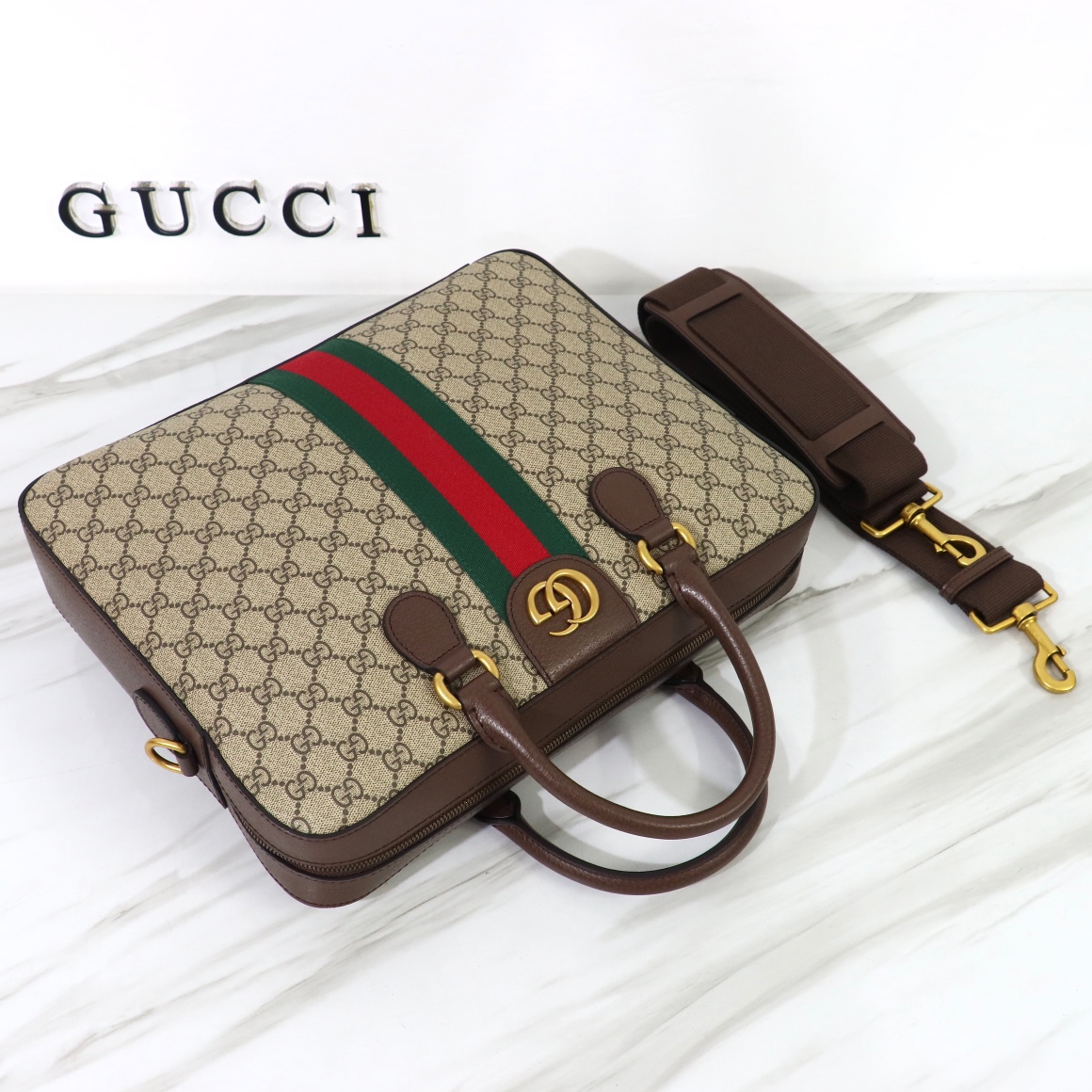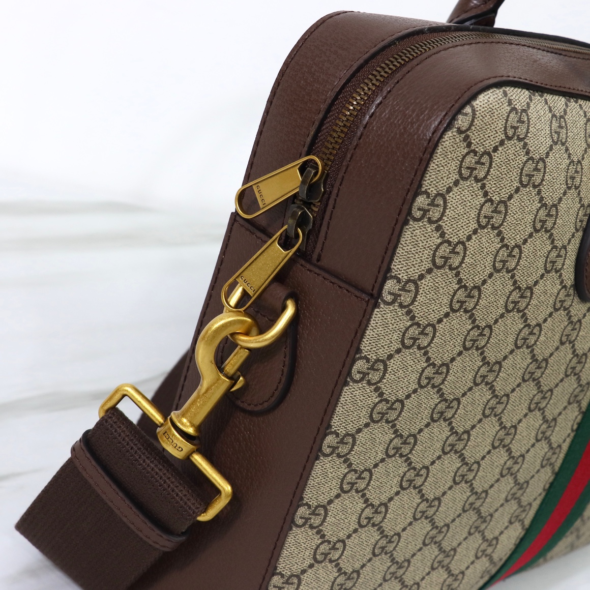 The Ophidia series introduces a brand-new designed briefcase, made of high-quality artificial canvas material, adorned with the brand's iconic stripe webbing and double G monogram hardware, two classic elements. The dual handle design, combined with a detachable shoulder strap, offers multiple carrying options. A secure zipper closure and a large internal open pocket add to the charm of the entire design.