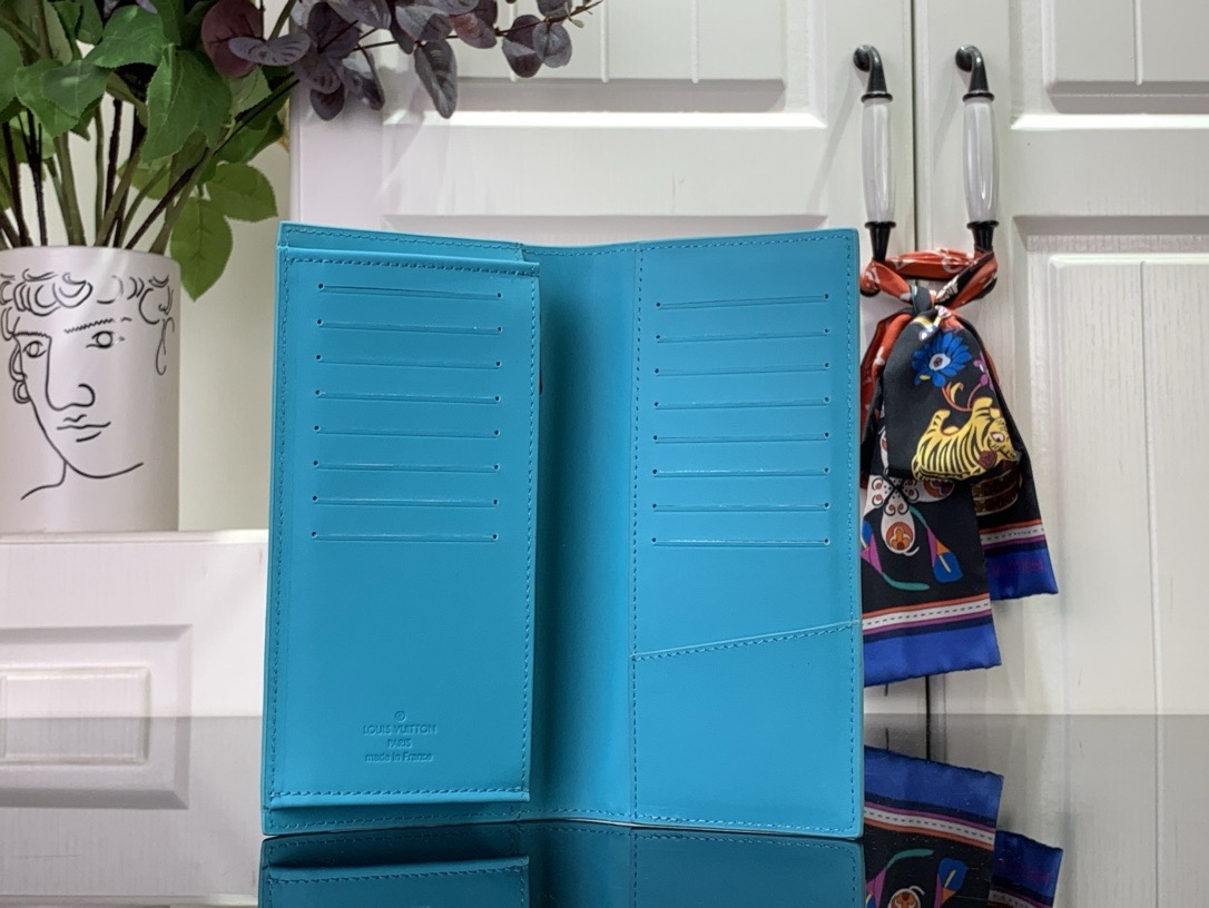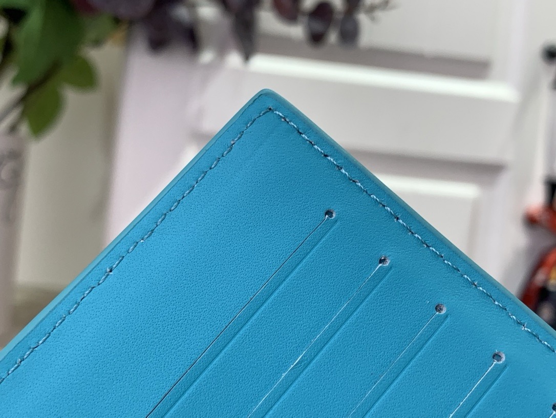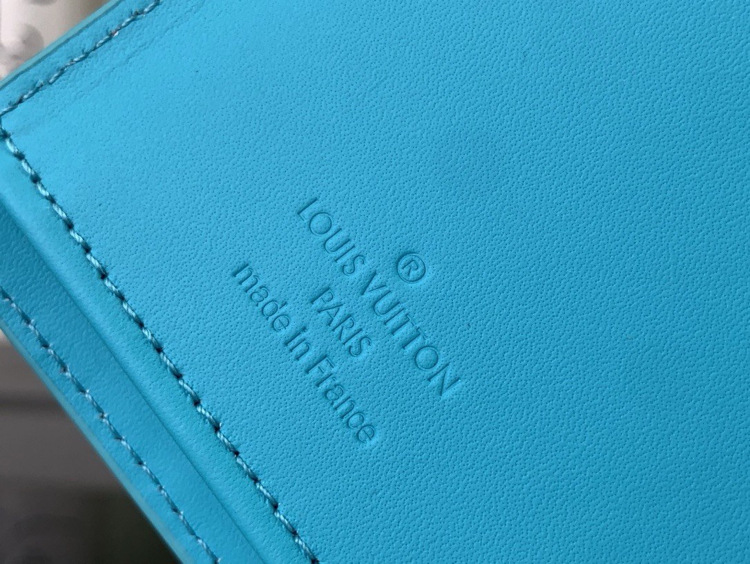 Compact wallet made of monogram eclipse reverse canvas with a monochrome pattern in shades of grey. The canvas is combined with turquoise cowhide leather on the edges of the wallet to create a fresh and dynamic look.
