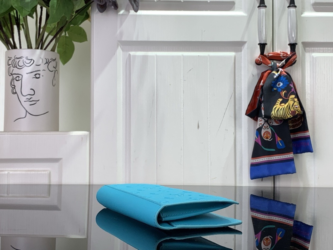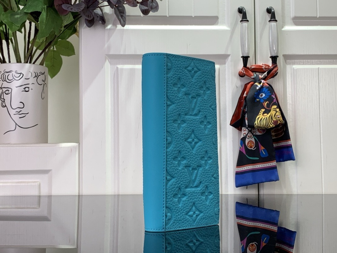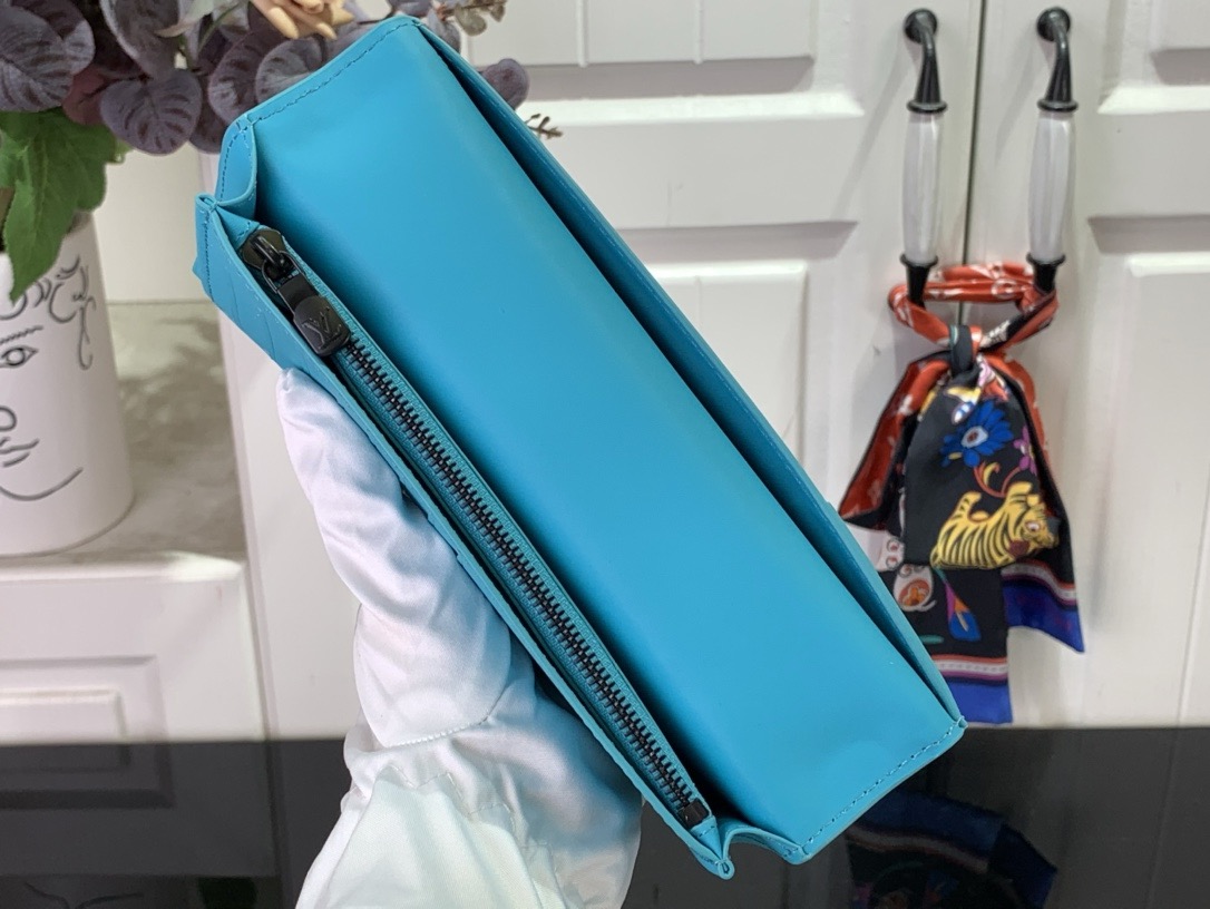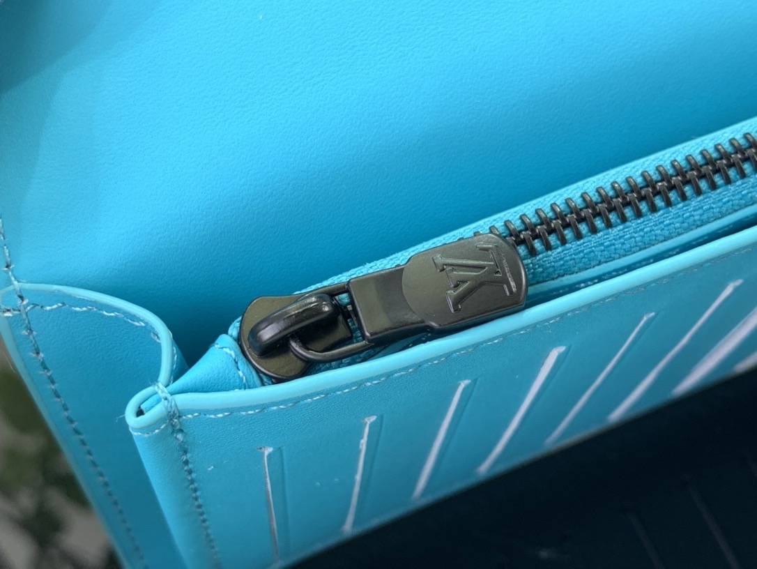 Compact wallet made of monogram eclipse reverse canvas with a monochrome pattern in shades of grey. The canvas is combined with turquoise cowhide leather on the edges of the wallet to create a fresh and dynamic look.