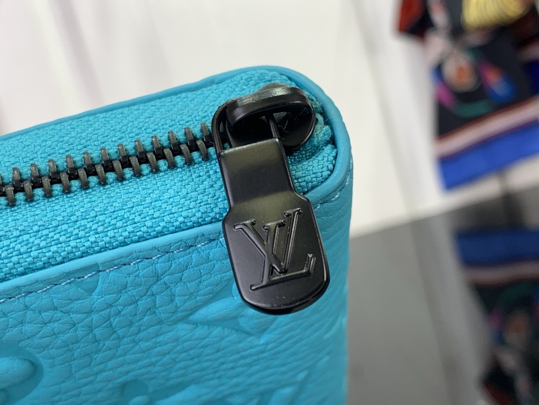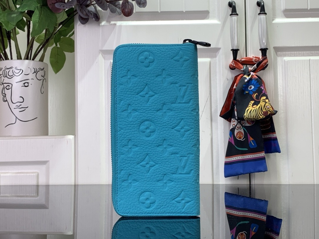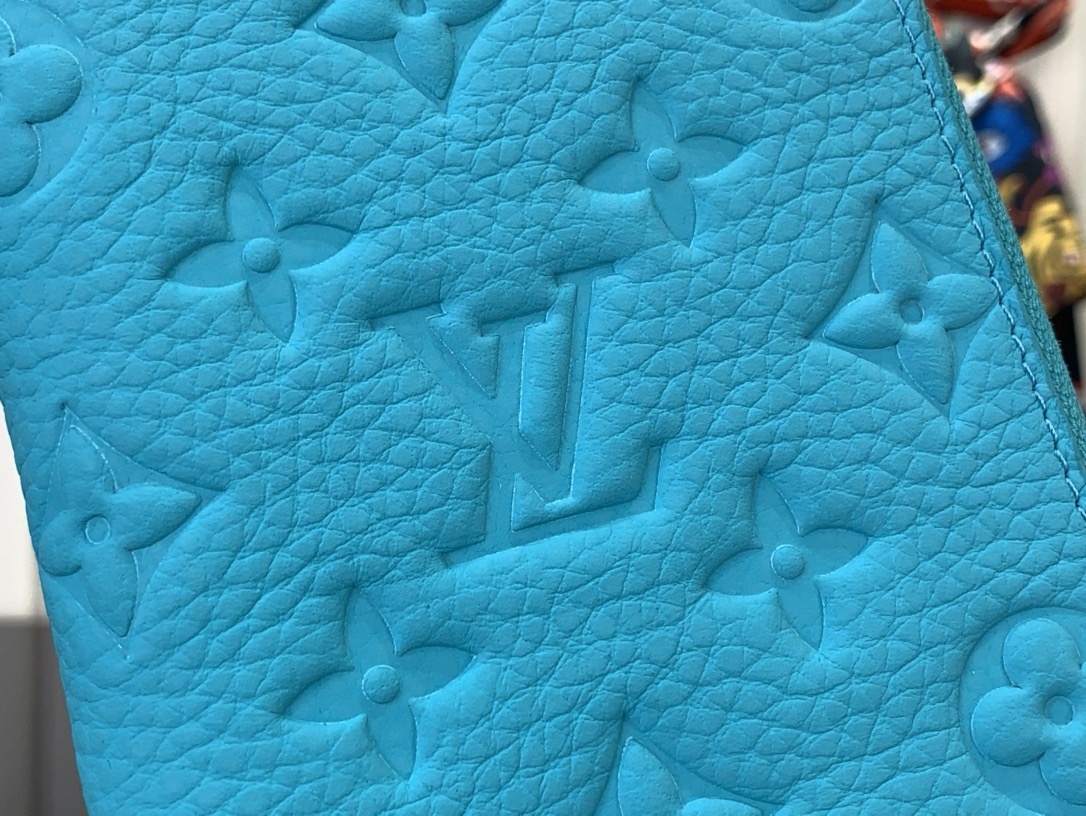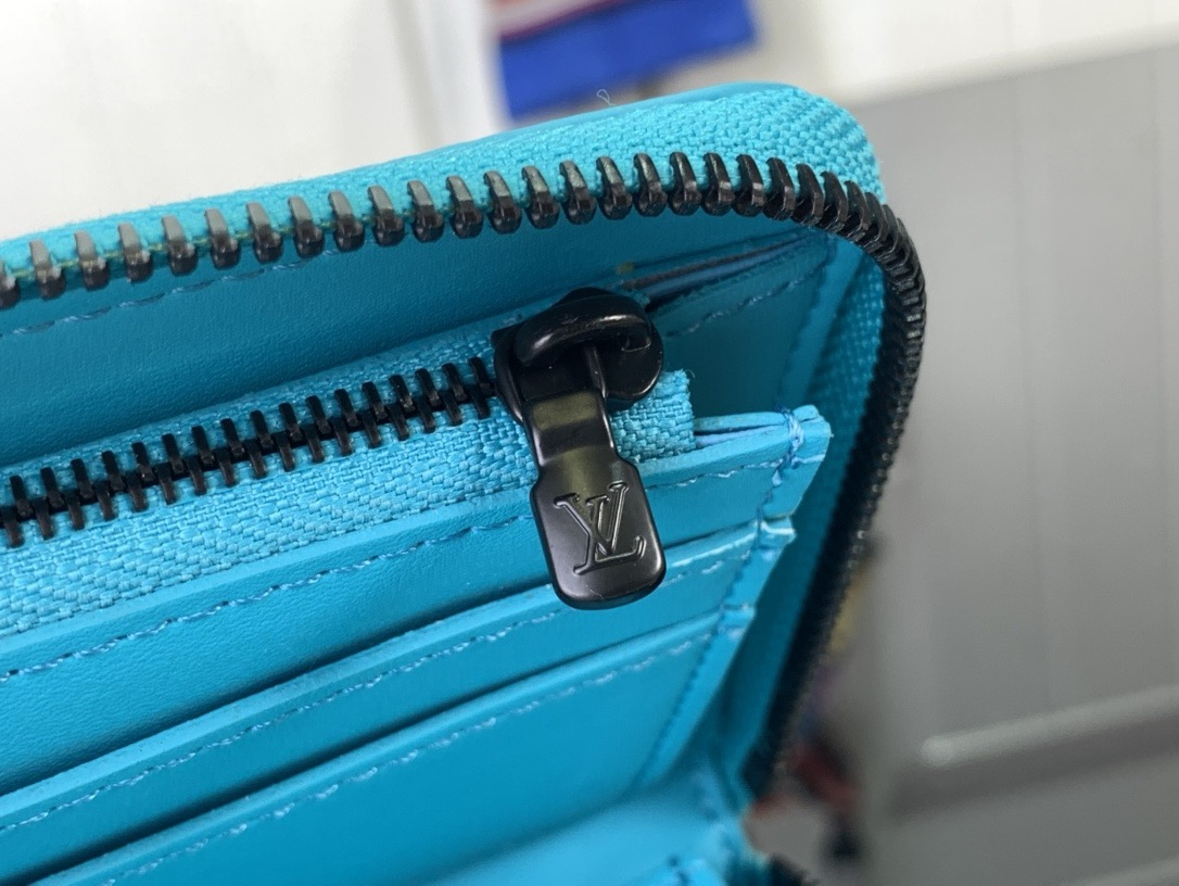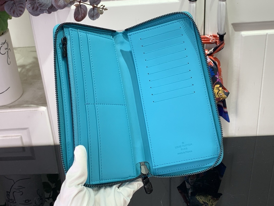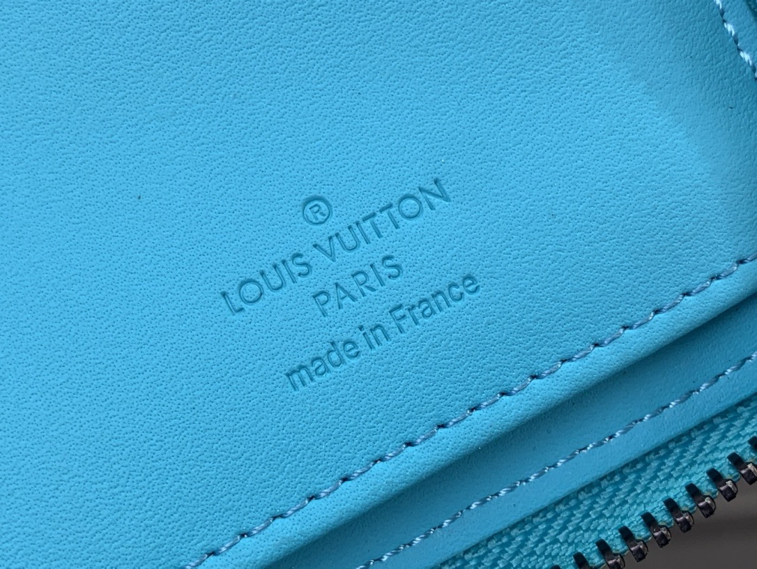 A compact wallet made of monogram eclipse reverse canvas with a monochrome pattern in shades of grey. The canvas is combined with turquoise cowhide leather on the edges of the wallet to create a fresh and dynamic look.