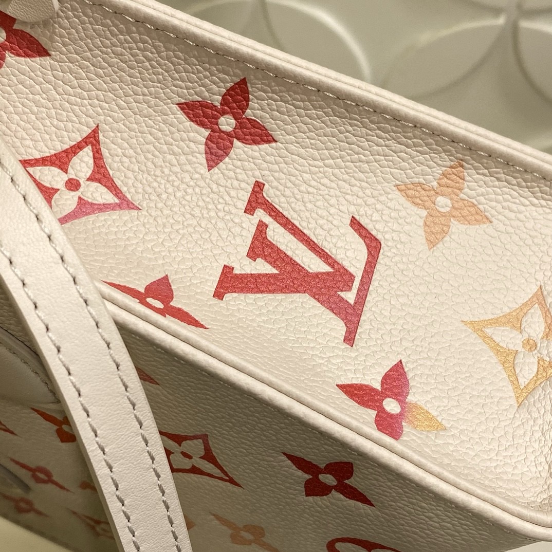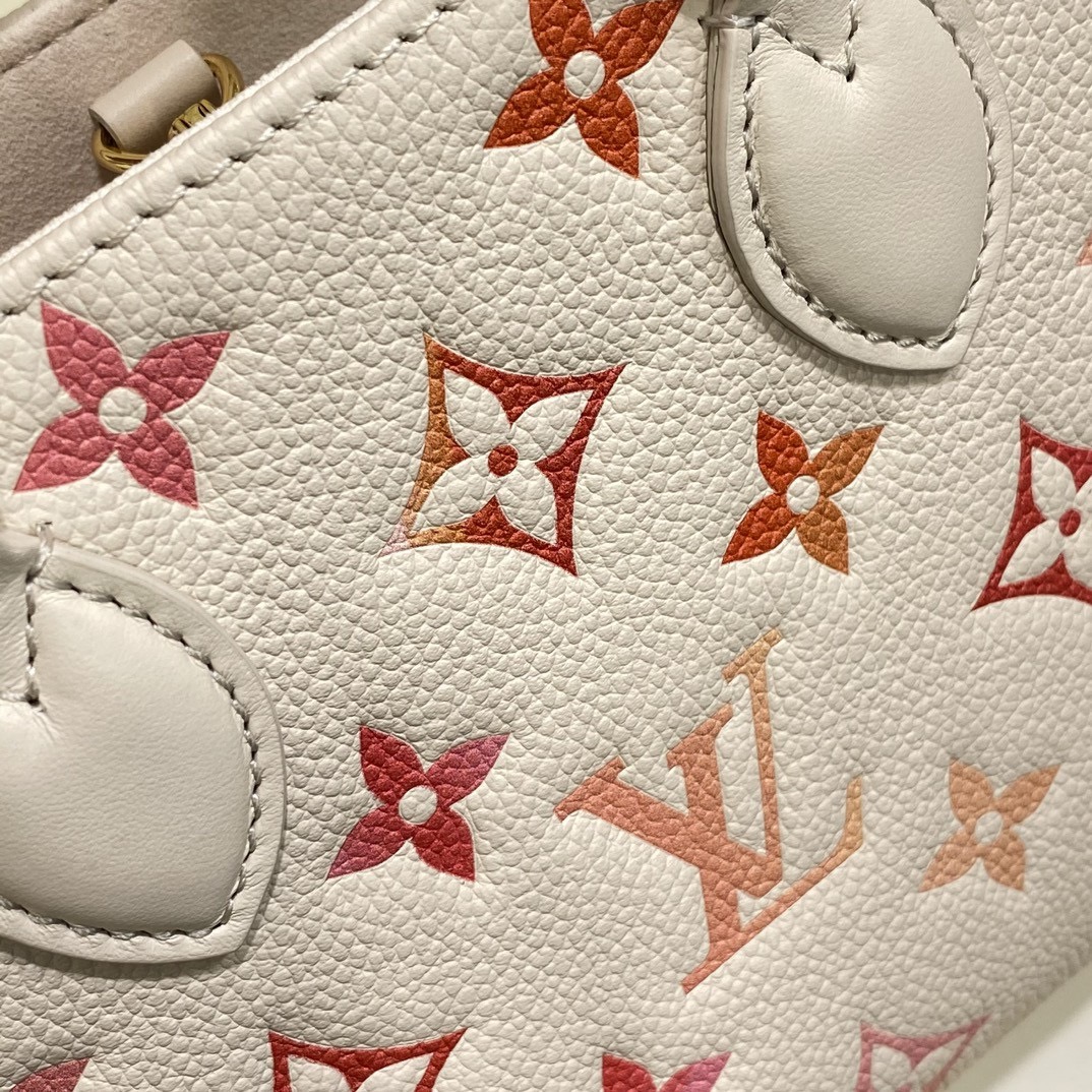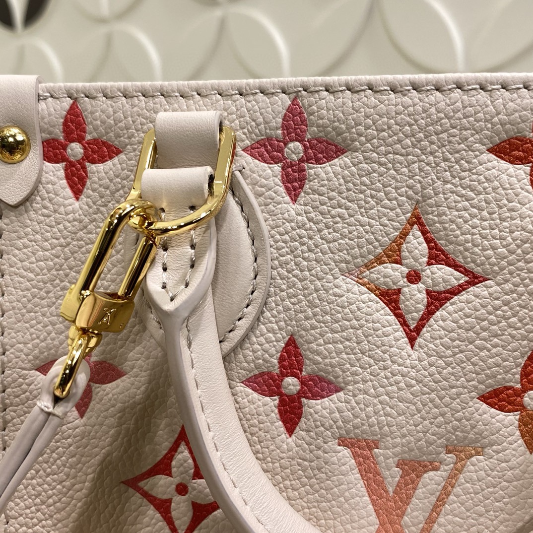 68558853 (Strawberry Red Silkscreen) M47115 This OnTheGo BB handbag is from the Sunrise Aquarelle series. It is a colorful Monogram Empreinte leather with watercolor effect LV letters and Monogram flowers, delicately depicting the rising sun. The silkscreen luster is like crystal morning dew, and the rolled leather handle and detachable and adjustable shoulder strap allow for multiple carrying methods.