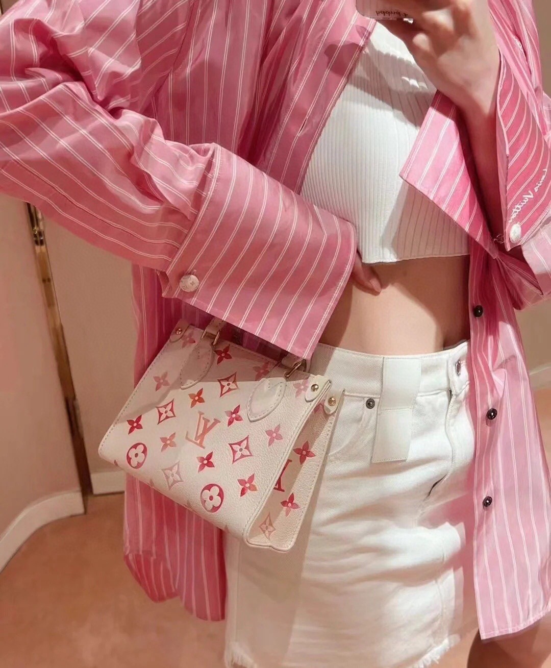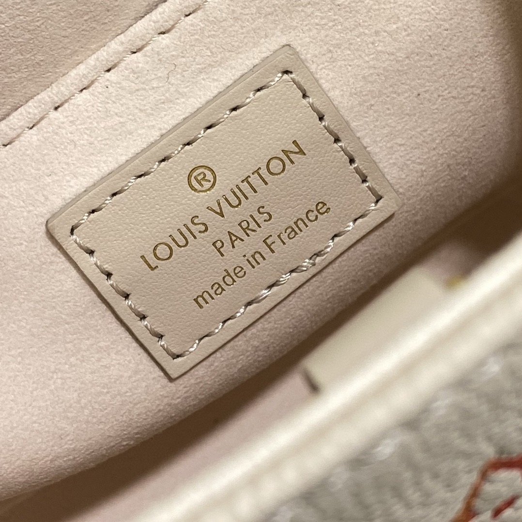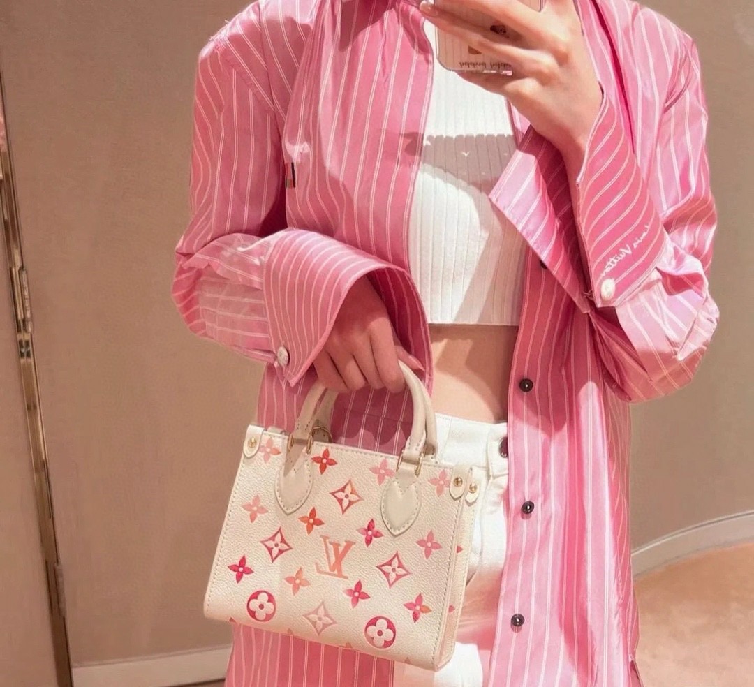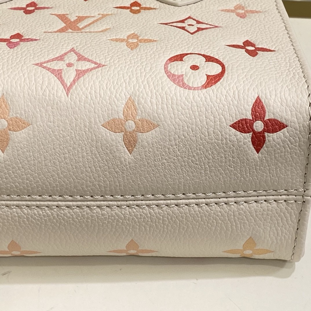 68558853 (Strawberry Red Silkscreen) M47115 This OnTheGo BB handbag is from the Sunrise Aquarelle series. It is a colorful Monogram Empreinte leather with watercolor effect LV letters and Monogram flowers, delicately depicting the rising sun. The silkscreen luster is like crystal morning dew, and the rolled leather handle and detachable and adjustable shoulder strap allow for multiple carrying methods.