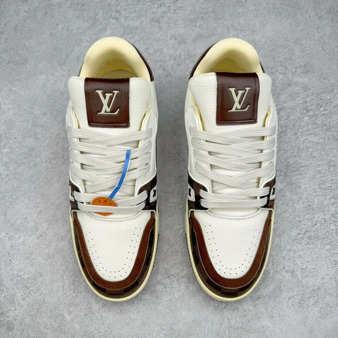 • Louis Vuitton Trainer LV low-top casual shoes, sneakers, athletic shoes, men's shoes, women's shoes, white, brown, black, checkered. 1ACWUE