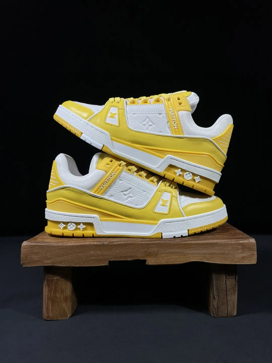 • Louis Vuitton Trainer, white and yellow, low-top casual shoes, sneakers, athletic shoes, men's shoes, women's shoes.