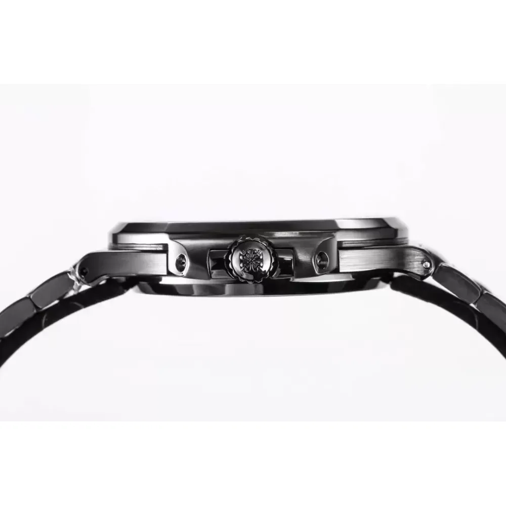 Black matte custom-grade ergonomic watch strap! The matte matte black case has an outstanding texture, is light in texture, and is corrosion-resistant. The dial is also made of matte black zirconia, and the overall appearance is a very cool black color. Wearing 5711 not only shows youthful vitality, but also exudes a strong sense of calmness from the inside out. It is a well-deserved "King of Steel Watches"