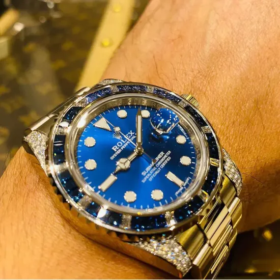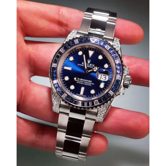 This is an 18K white gold Rolex Submariner 116659SABR. t includes an integral Rolex 18K white gold Oysterlock bracelet with a folding deployment clasp and a scratch resistant sapphire crystal. It has a screwed down solid case back and Triplock winding crown protected by diamond set crown guards. The solid three-body 40 mm. diameter case, straight diamond set lugs, bracelet and flat knurled bezel, are polished and brushed. The graduated unidirectional revolving bezel is white gold and set with 27 b aguette cut sapphires, and 11 baguette cut diamonds every 10 minutes, the dive triangle at the 60-minute position is set with a triangular diamond. It has a sunburst blue dial with luminous white gold-set dot, baton, and arrow hour index markers, luminous white gold "Mercedes" style Rolex minute and hour hands, a center sweep second hand with a luminous "lollipop" indicator, a white minute/second perimeter chapter ring, and a cyclops magnification lens for the date aperture window at 3 o'clock. It's water resistant to 330 meter/1,000 feet, it has a 48-hour power reserve at full winding, and the 13mm thick case, dial, and movement are all signed.