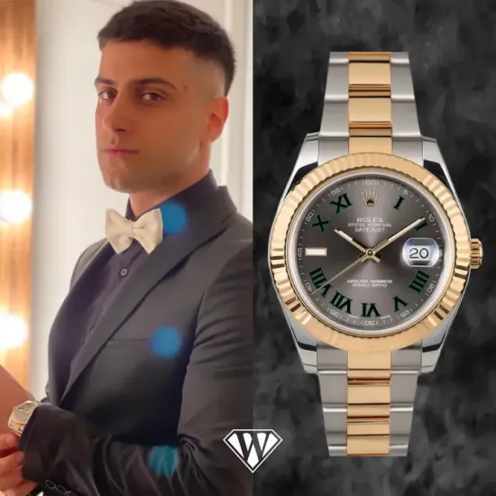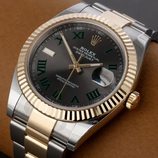 41mm Yellow Rolesor case with 904L steel monobloc middle case, screw-down steel back, 18K yellow gold screw-down crown, 18K yellow gold fluted bezel, scratch-resistant double anti-reflective sapphire crystal with cyclops lens over the date, slate dial, green Roman numerals, Rolex caliber 3235 perpetual self-winding movement with date at 3 o’clock that changes instantaneously at midnight in a few thousandths of a second, approximately 70 hours of power reserve, yellow Rolesor Oyster bracelet made from a combination of 904L steel and 18K yellow gold with three-piece links, folding Oysterclasp buckle with Easylink 5mm comfort extension link. Waterproof to 100 meters.