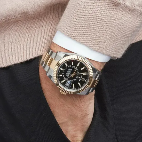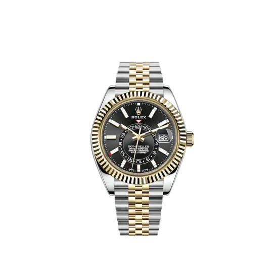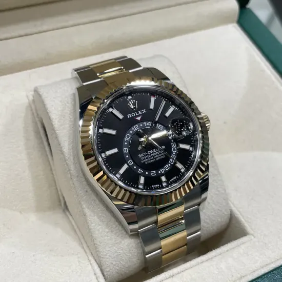 Rolex Sky-Dweller Men's Watch 326933-0005. This 42mm watch features a stainless steel case with an 18k yellow gold fluted Ring Command bezel and a two tone Jubilee bracelet. The black dial has an annual calendar feature and a GMT second time zone feature indicated by a rotating disc. It is powered by the Rolex Caliber 9001 self-winding automatic COSC Superlative Chronometer certified movement with a 72 hour power reserve.