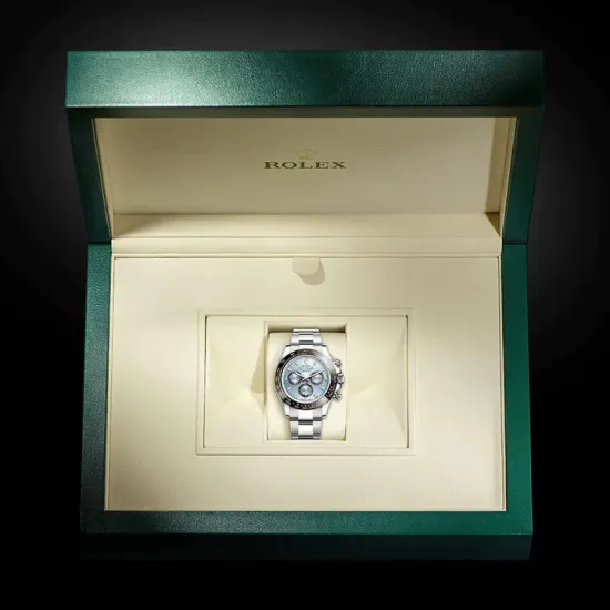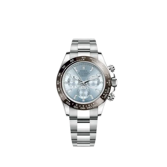 40mm 950 platinum case, chestnut brown monobloc Cerachrom bezel with engraved tachymetric scale deposited with platinum via PVD, screw-down crown and push buttons, ice blue dial with chestnut brown lacquer counters, Chromalight appliques on hands, index hour markers with Chromalight appliques, self-winding perpetual mechanical chronograph movement, folding Oysterlock bracelet with Easylink 5 mm comfort extension. Waterproof to 100 meters.
