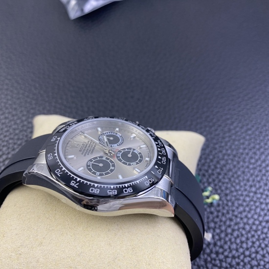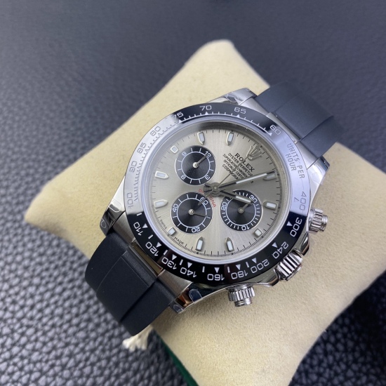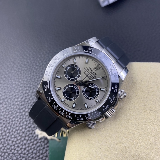 In perfect condition, this 116519LN is the most sought after, and hardest to get, of all gold Daytonas... The steely grey Panda dial and black scratch-proof ceramic bezel look superb with the 18ct white gold case and sporty waterproof rubber Oysterflex bracelet.