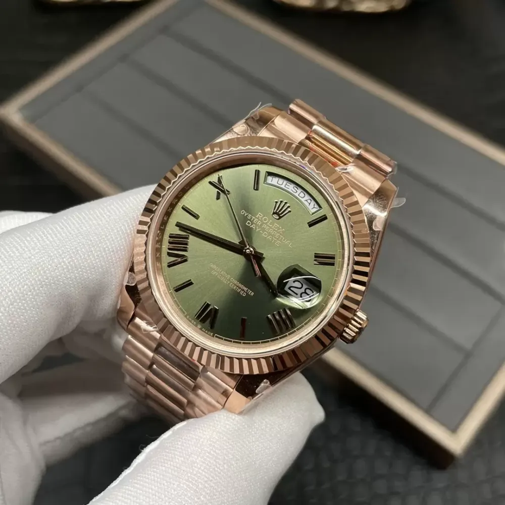 Rolex Day-Date 228235 Rose Gold Green Roman Dial President Bracelet Swiss 3255 Movement