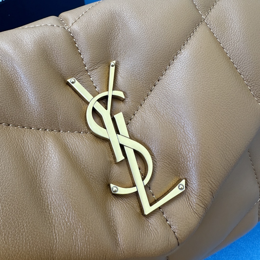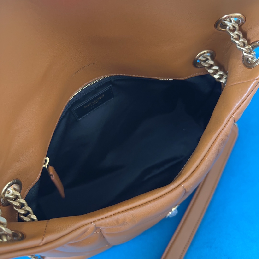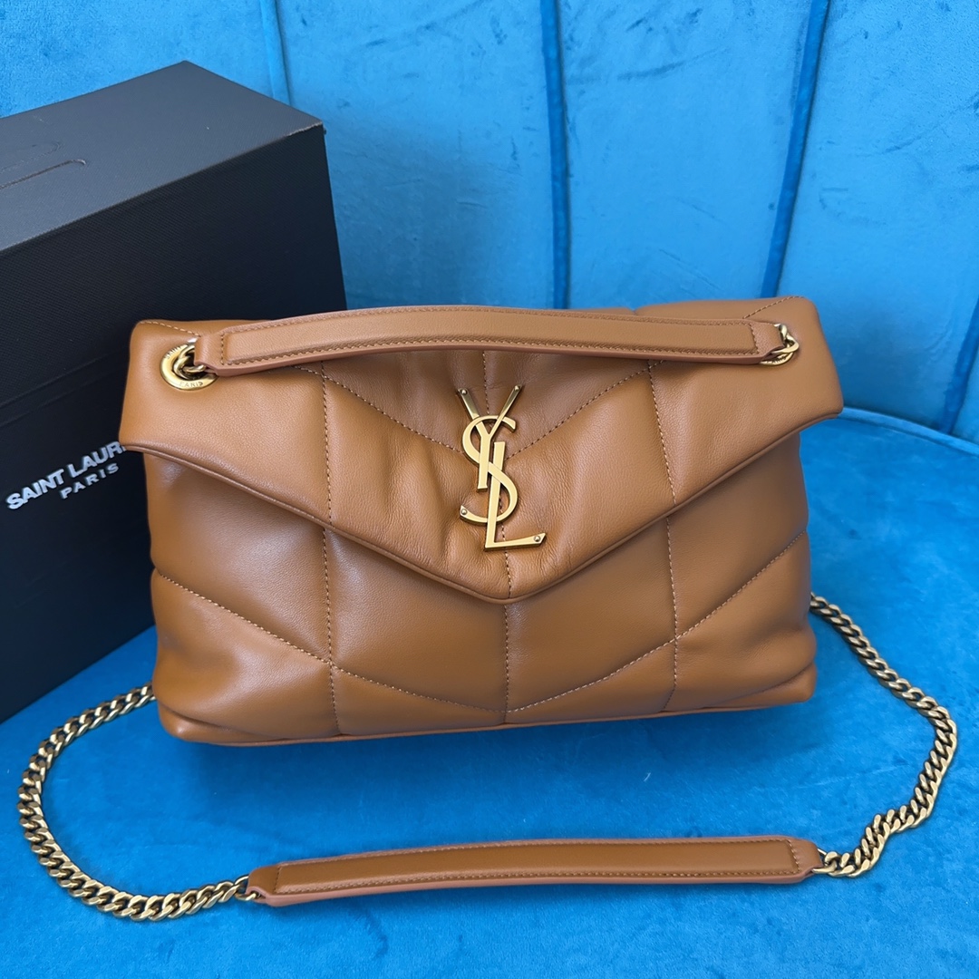 Loulou Ffer Small Quilted Lambskin Bag by Saint Laurent, featuring the brand's letter logo and adorned with a Y-shaped metal logo. It comes with a genuine leather chain strap that can be doubled over for use as a shoulder bag. Made of 100% lambskin, with silver brushed metal hardware, satin lining, a magnetic four-clasp closure, and one zippered interior pocket.