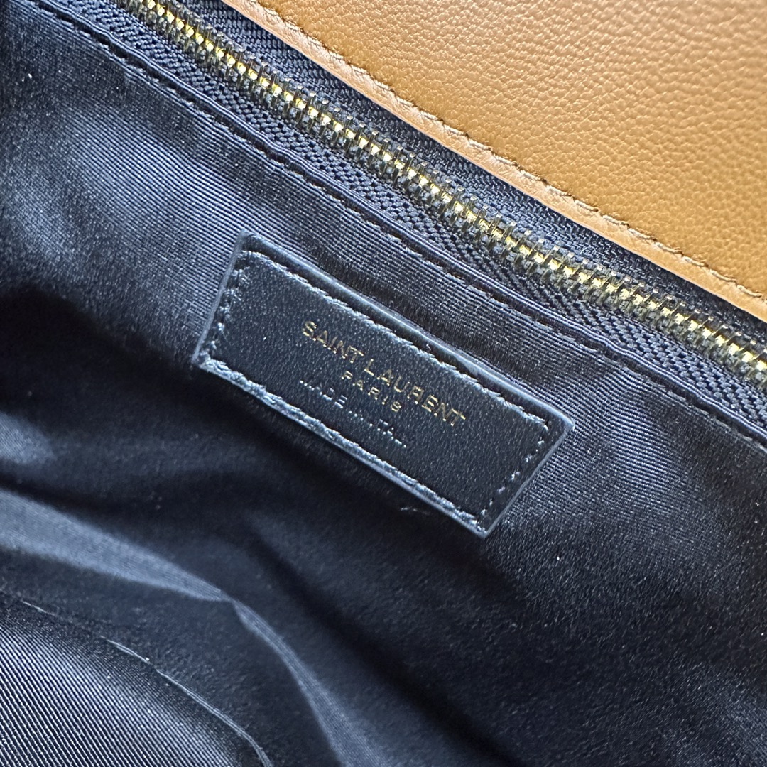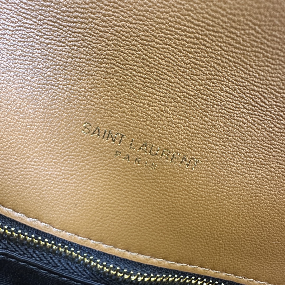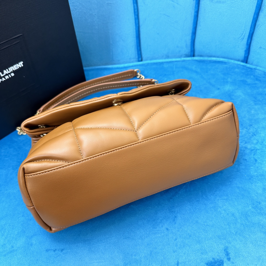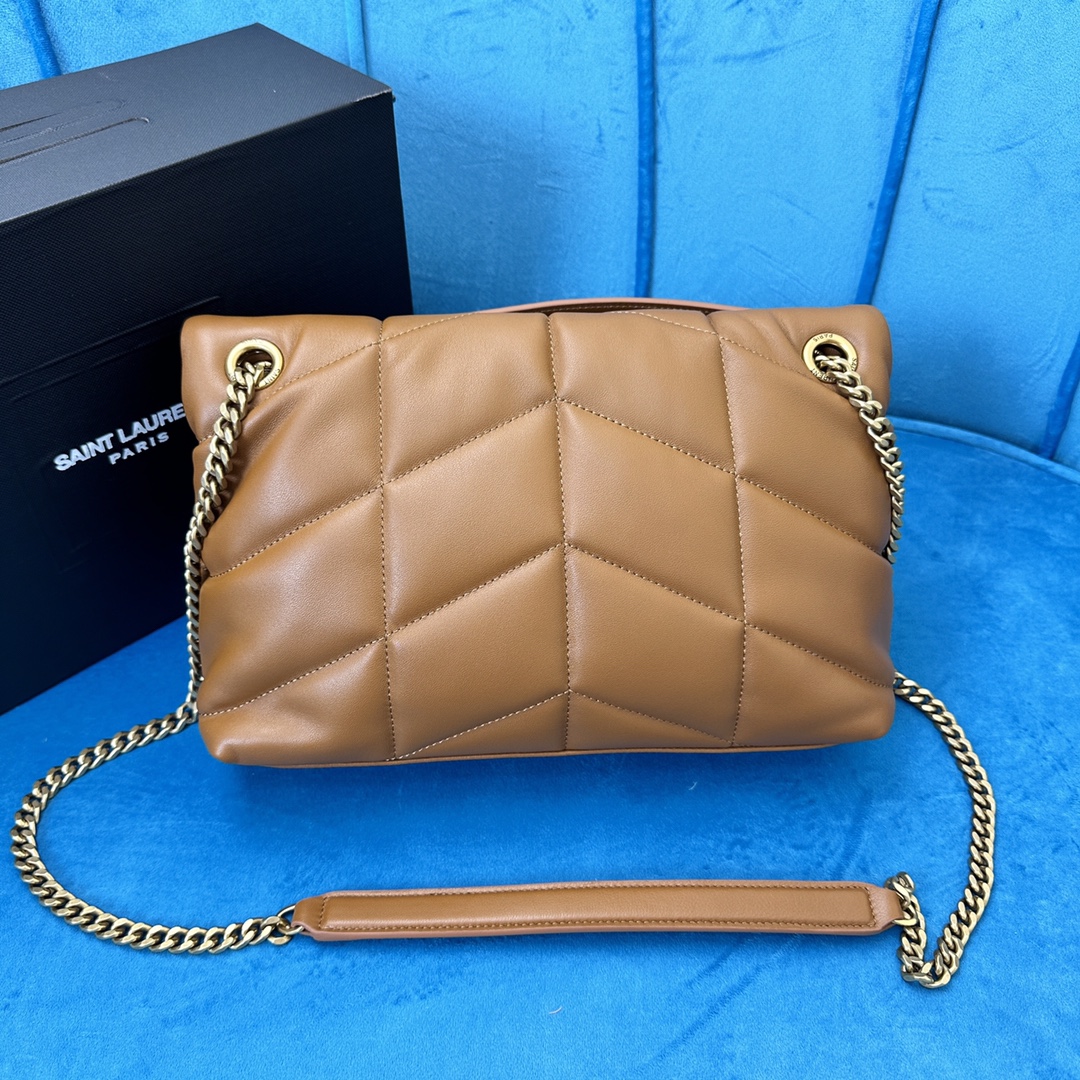 Loulou Ffer Small Quilted Lambskin Bag by Saint Laurent, featuring the brand's letter logo and adorned with a Y-shaped metal logo. It comes with a genuine leather chain strap that can be doubled over for use as a shoulder bag. Made of 100% lambskin, with silver brushed metal hardware, satin lining, a magnetic four-clasp closure, and one zippered interior pocket.